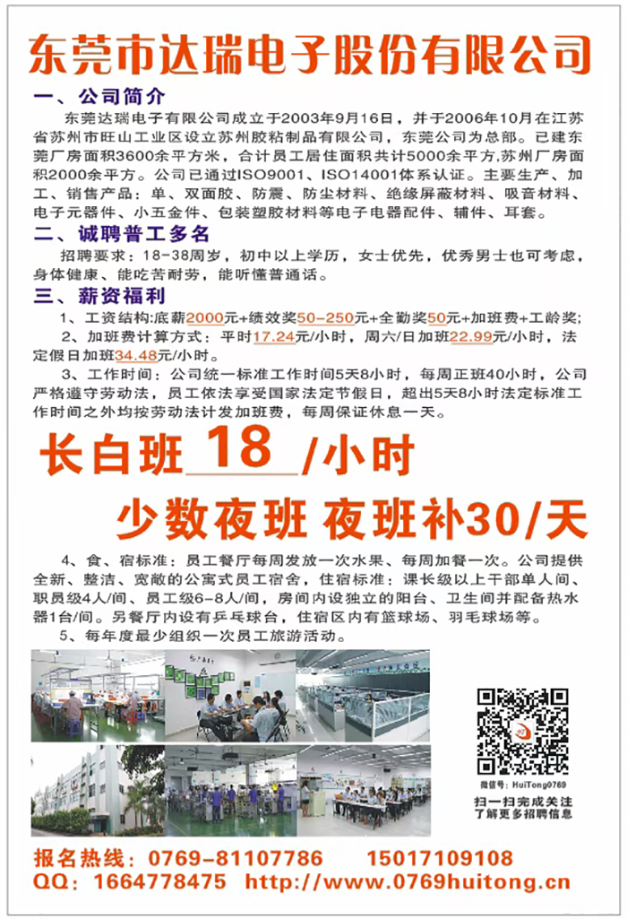 长白班18/小时 少数夜班 夜班补30/天