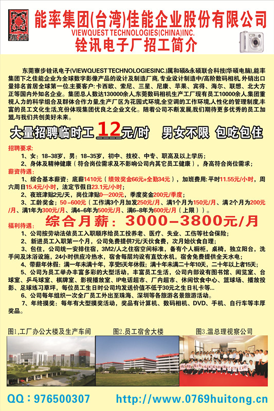 铨讯电子厂大量招聘临时工