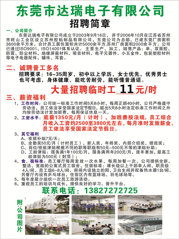 东莞达瑞电子诚聘普工多名